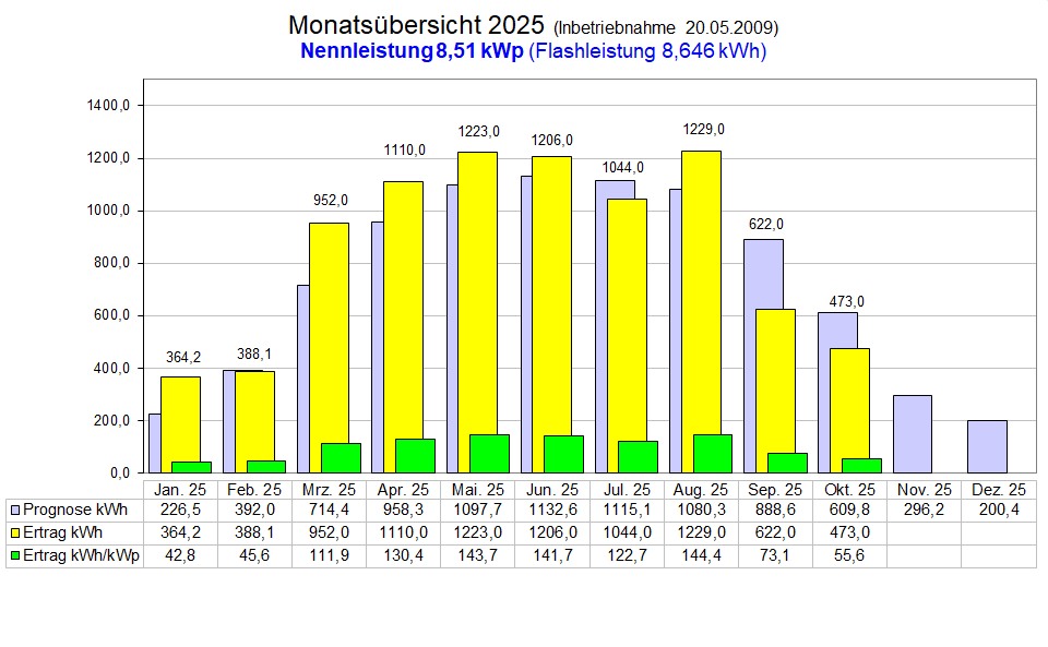 mittlerer Energieertrag pro kWp = erzeugte Strommenge in kWh geteilt durch Nennleistung 8,51 kWpeak